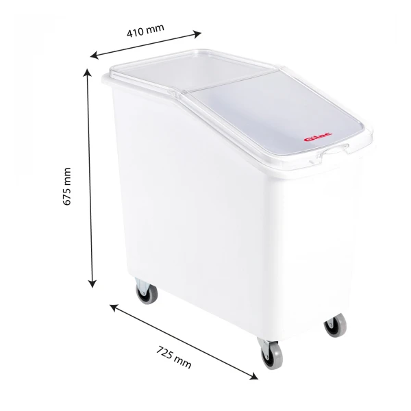 Bac à ingrédients. Grande capacité : 100 L Couvercle intégral transparent qui préserve les aliments. Facile d’accés. 4 roulettes (ø75 mm) dont 2 pivotantes pour une grande mobilité. Fond totalement lisse sans visserie apparente. Coins arrondis et parois intégralement lisses pour faciliter le nettoyage et assurer une hygiène parfaite. Format idéal pour se glisser sous un plan de travail pour un gain de place.