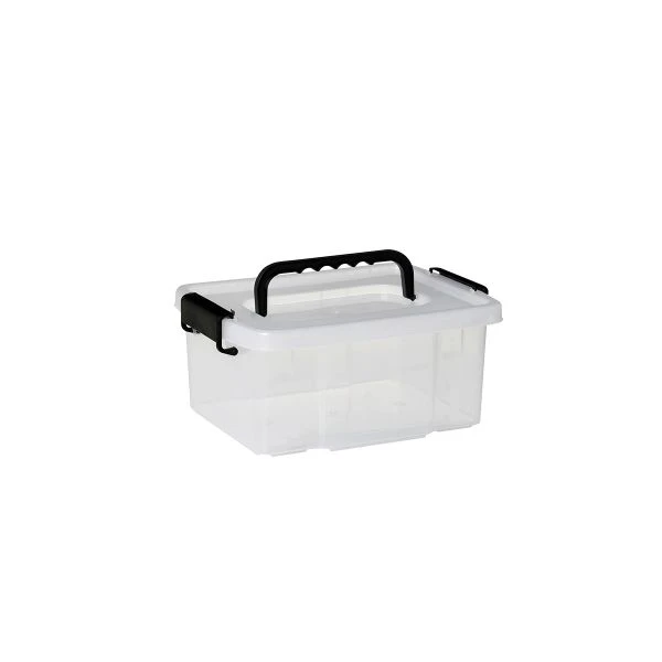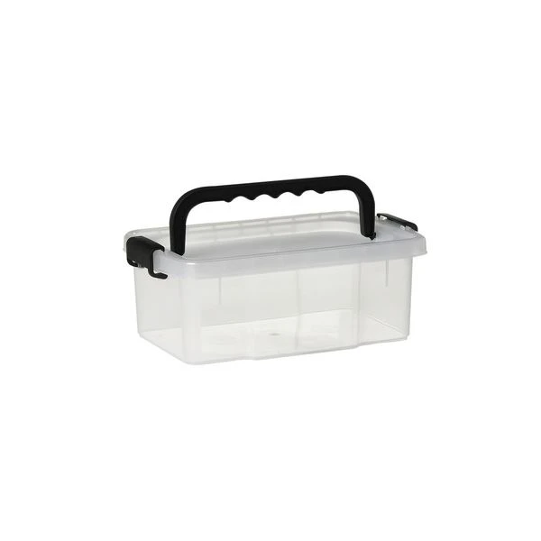 Des clips sur deux côtés assurent une bonne fermeture du couvercle, et la grande poignée avec des emplacements pour les doigts facilite le transport de la boîte.