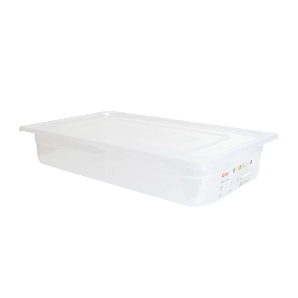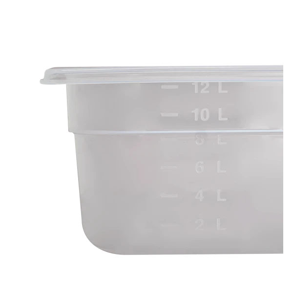 Lot de deux bacs GN 1/1 en PP (polypropylène) avec couvercles. Trois hauteurs disponibles au choix : 100 mm, 150 mm ou 200 mm. Fabriqués à partir de polypropylène de qualité alimentaire, ces bacs sont conçus pour résister à une utilisation intensive et offrir une durabilité exceptionnelle. Fond arrondi sans zone de rétention pour un nettoyage facilité. Taille GN 1/1 adaptée aux supports gastronormes et autres équipements de cuisine standards. Contenants idéals pour le stockage, l’organisation des aliments ou le transport. Matière transparente (bac et couvercle) pour une visibilité du contenu facilité. Graduations disponibles sur le côté du bac pour mesurer aisément la contenance. Etiquette IML inaltérable intégrée sur chaque bac pour garantir le respect des normes HACCP et la traçabilité de chaque préparation.