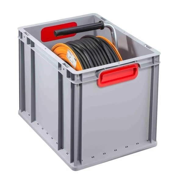 Bac Euro en Polypropylène, poignées fermées rouges, empilable, résistant aux acides & huiles.