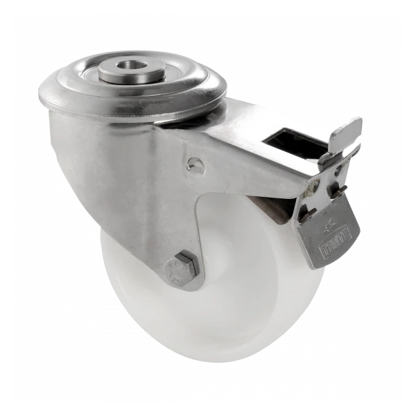 La solution économique pour déplacer simplement les bacs grands volumes. Roues et visseries Inox. Acier Inoxydable recommandé en environnements humides (aucune altération des roulements même en présence d’eau). Résistance à la charge donnée à titre indicatif (dépend de la répartition de la charge et de la température d’utilisation). Joints présents sur l’axe de fixation des roues pour une étanchéité parfaite. Le litrage indiqué correspond au bac rempli à ras bord. Si la charge du bac est importante (220 L, 310 L et 500 L) sur des grandes distances, privilégier la configuration roues mixtes pour une meilleure maniabilité ou les bacs + chariots.
