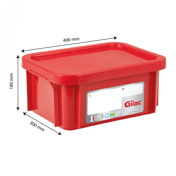Bac plastique alimentaire HACCP 400 x 300 rectangulaire. Pour les gros volumes de stockage, le couvercle supporte des charges élevées. Bac polyvalent. Cartouche d’identification réinscriptible pour le suivi des stocks. Design ne présentant aucune zone de rétention. Lavable en machine. Poignées en retrait pour une meilleure manipulation. Empilable sans couvercle.Compatible avec tous les socles 4 et 6 roues GILAC.