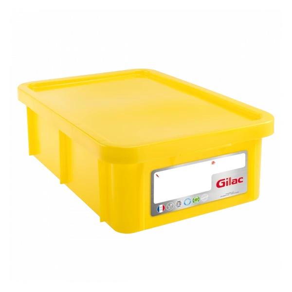 Bac plastique alimentaire HACCP 600 x 400 rectangulaire. Pour les gros volumes de stockage, le couvercle supporte des charges élevées. Bac polyvalent. Cartouche d’identification réinscriptible pour le suivi des stocks. Design ne présentant aucune zone de rétention. Lavable en machine. Poignées en retrait pour une meilleure manipulation. Empilable sans couvercle.Compatible avec tous les socles 4 et 6 roues GILAC.