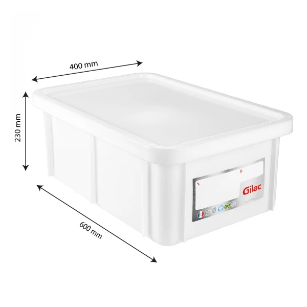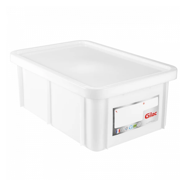Bac plastique alimentaire HACCP 600 x 400 rectangulaire. Pour les gros volumes de stockage, le couvercle supporte des charges élevées. Bac polyvalent. Cartouche d’identification réinscriptible pour le suivi des stocks. Design ne présentant aucune zone de rétention. Lavable en machine. Poignées en retrait pour une meilleure manipulation. Empilable sans couvercle.Compatible avec tous les socles 4 et 6 roues GILAC.