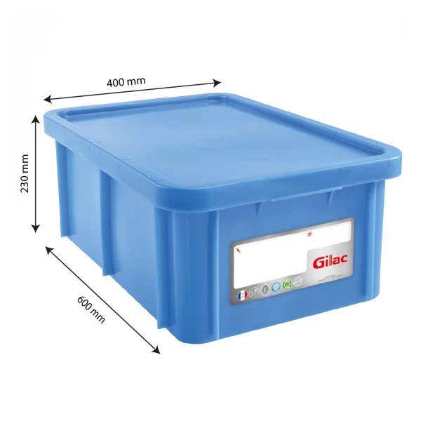 Bac plastique alimentaire HACCP 600 x 400 rectangulaire. Pour les gros volumes de stockage, le couvercle supporte des charges élevées. Bac polyvalent. Cartouche d’identification réinscriptible pour le suivi des stocks. Design ne présentant aucune zone de rétention. Lavable en machine. Poignées en retrait pour une meilleure manipulation. Empilable sans couvercle. Compatible avec tous les socles 4 et 6 roues GILAC.
