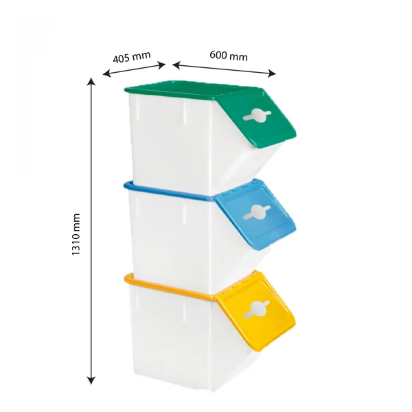 Bacs adaptés au tri sélectif. Grande facilité d’accès.Empilés, le bac supérieur permet de bloquer le couvercle en position ouverte pour faciliter l’utilisation du bac. Vendus en lot de 3 bacs avec un couvercle bleu, un couvercle jaune et un couvercle vert pour faciliter le tri des déchets. Bacs empilables (avec couvercle) et emboîtables (sans couvercle) pour le stockage. Bacs compatibles avec les socles rouleurs universels 600 x 400 GILAC pour faciliter le déplacement et la manutention. Les dimensions indiquées dans le tableau des caractéristiques produit correspond à la hauteur d’un bac avec couvercle. La hauteur du lot de 3 bacs empilés : 1310 mm. Les dimensions du lot livré en carton : 700 x 420 x 730 mm.