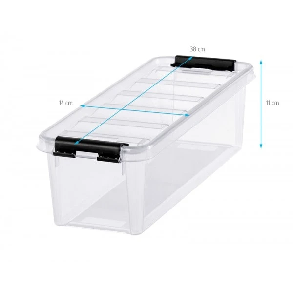 Boîte transparente avec casiers intégrés, transparente, avec clips de fermeture blancs ou noirs au choix.
