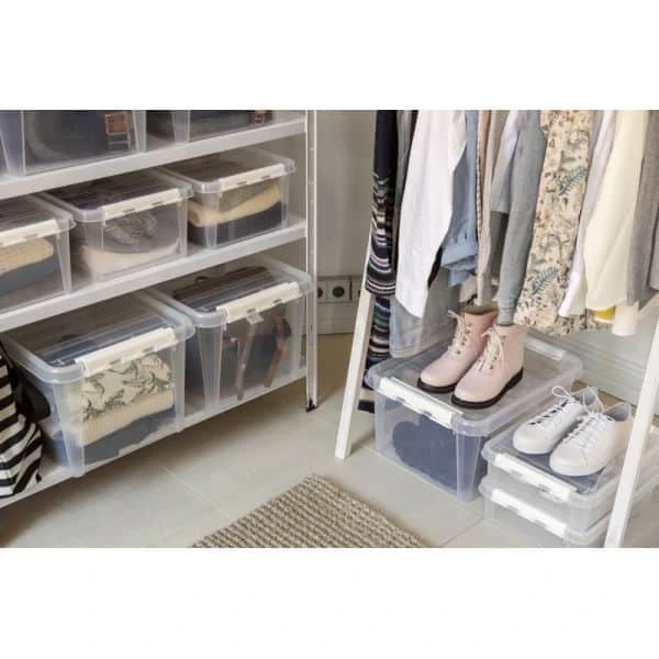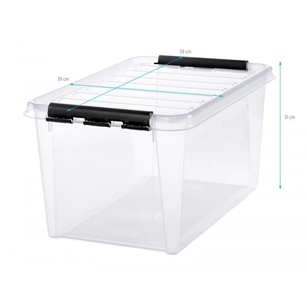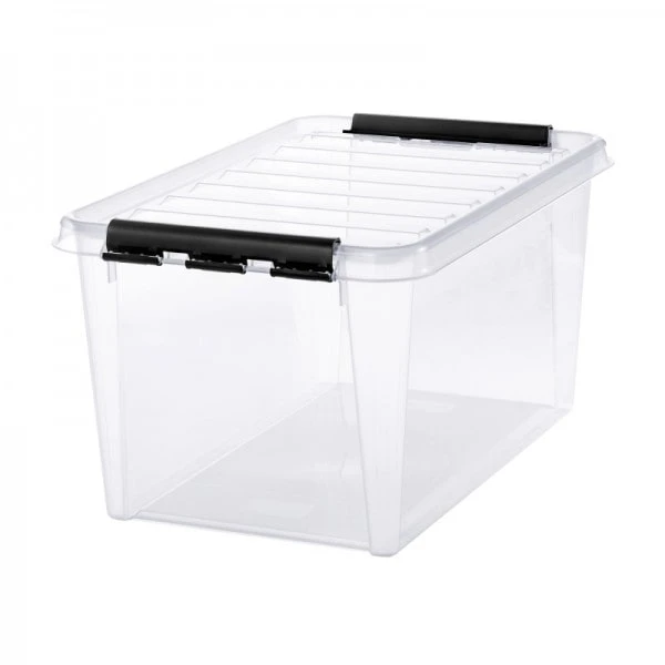 Boîte de rangement transparente avec couvercle et clips de fermeture, noirs ou blancs au choix.