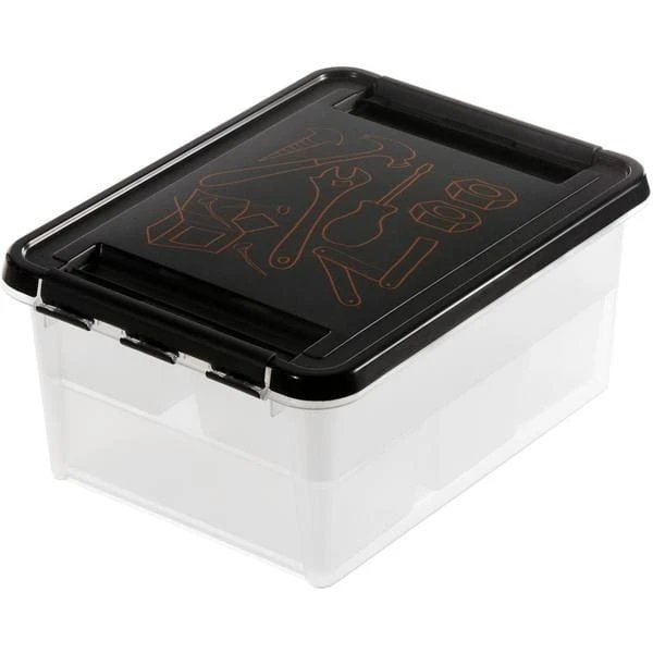 Boîte de rangement de 14 litres avec compartiment et couvercle décoré. Parfait pour une utilisation comme boîte à outils.