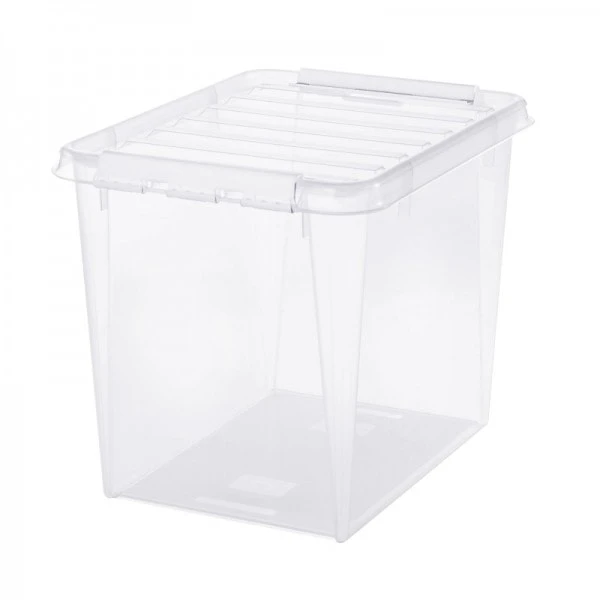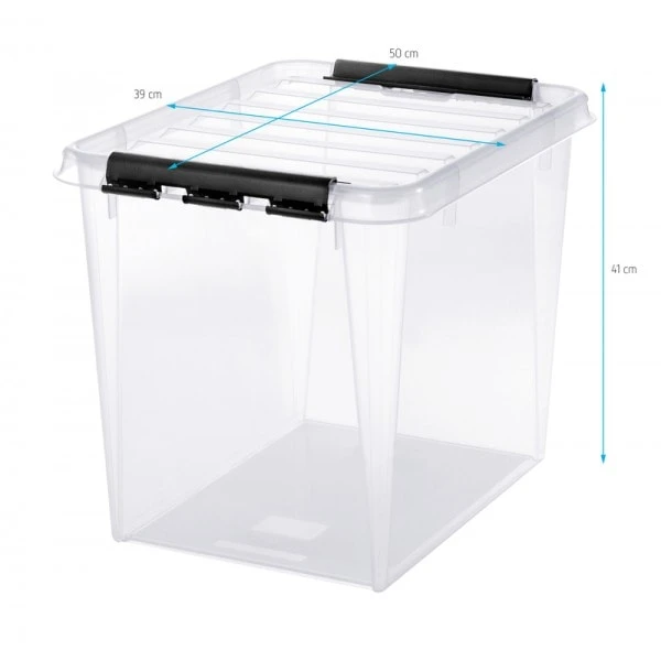 Boîte de rangement transparente avec couvercle et clips de fermeture.