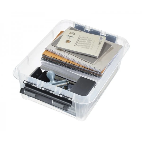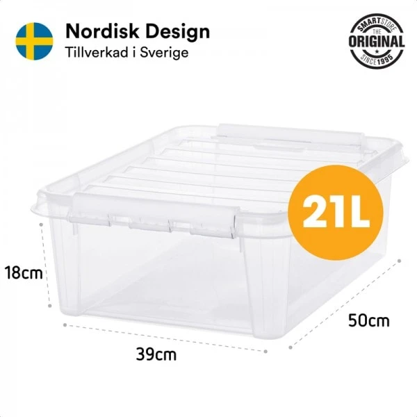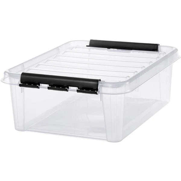 Boîte de rangement CLASSIC 24, 21 litres transparente, avec couvercle et clips de fermeture (blancs ou noirs).
