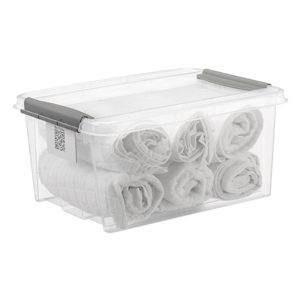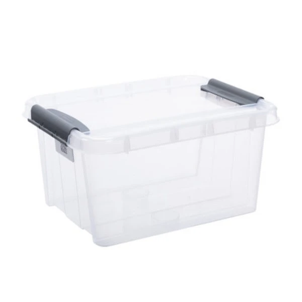 boîte transparente avec couvercle et clips gris (fermetures à clip)