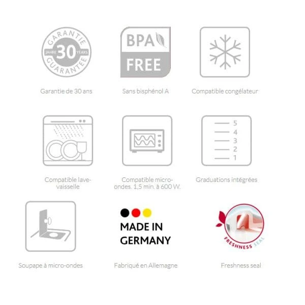 100 % adapté au micro-ondes, avec soupape, lavable au lave-vaisselle.