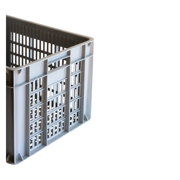 Caisse de stockage en plastique alimentaire (PEHD). Le format compact 500 x 400 mm, ses parois et son fond ajourés et ses poignées pour assurer une bonne prise en main font de cette caisse, une alliée indispensable au quotidien. Caisse empilable de qualité professionnelle.