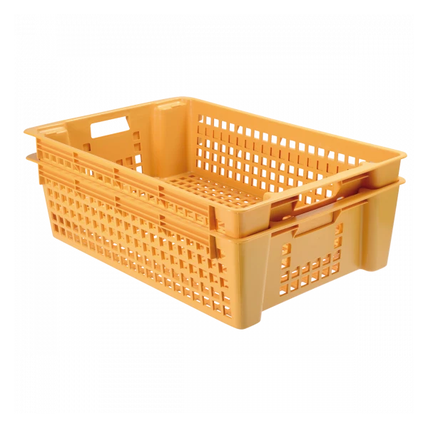 Caisse ajourée empilable et emboîtable. Caisse légère. Poignées intégrées ergonomiques pour une préhension facile et pratique. Empilable jusqu’à 2m. Empilable et emboîtable par rotation d’un demi-tour avec indicateur de sens.