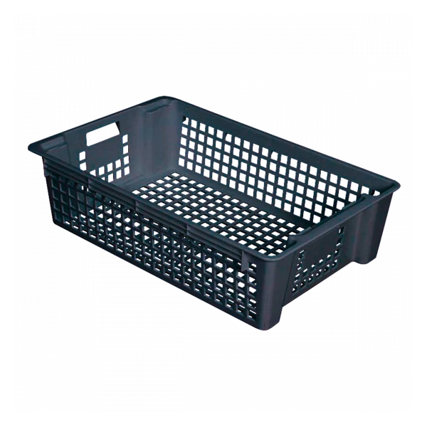 Caisse ajourée empilable et emboîtable. Caisse légère. Poignées intégrées ergonomiques pour une préhension facile et pratique. Empilable jusqu’à 2m. Empilable et emboîtable par rotation d’un demi-tour avec indicateur de sens.
