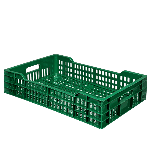 Caisse ajourée 600 x 400 en plastique recyclé apte au contact alimentaire.