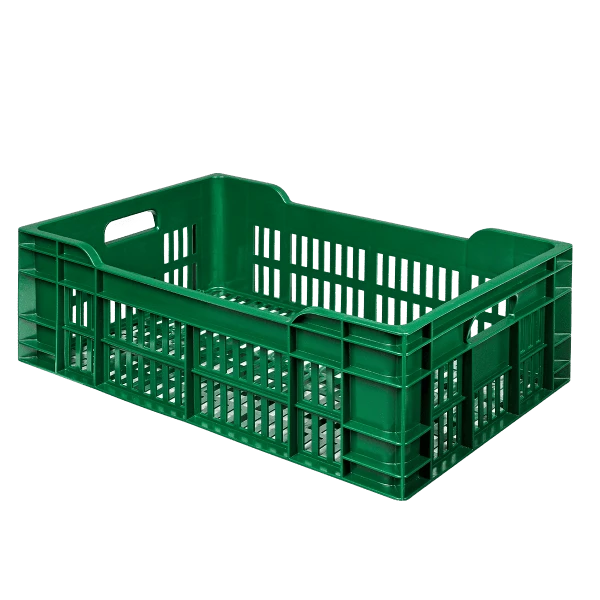 Caisse ajourée 600 x 400 en plastique recyclé apte au contact alimentaire.