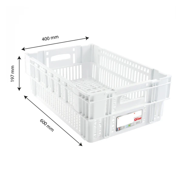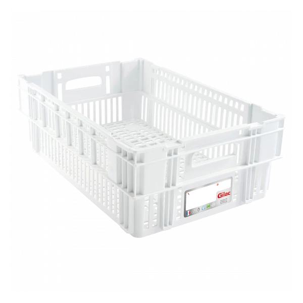 Caisse 600 x 400 ajourée. Idéale en cuisine centrale pour liaison froide. Aération du contenu. Empilable et emboîtable par rotation d’un demi-tour. Ajourages importants qui minimisent le temps de descente en température et facilitent le nettoyage. Caisses disponibles en 5 couleurs HACCP, pour aider à maîtriser les risques sanitaires en appliquant la méthode HACCP. Cartouche d’identification permettant une gestion de la traçabilité et le suivi des stocks. Ce marquage est réalisé par IML : un procédé qui permet de fusionner l’étiquette et la matière plastique durant le moulage par injection pour la rendre inaltérable et réinscriptible (à utiliser avec un marqueur plastique effaçable à l’eau).