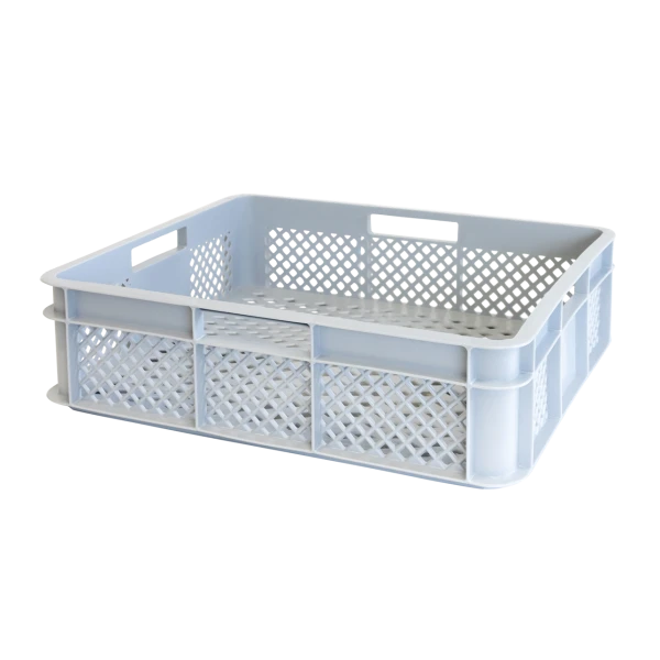 Caisse de stockage en plastique alimentaire (PEHD). Le format compact 400 x 350 mm, ses parois et son fond ajourés et ses poignées pour assurer une bonne prise en main font de cette caisse, une alliée indispensable au quotidien. Caisse empilable de qualité professionnelle.