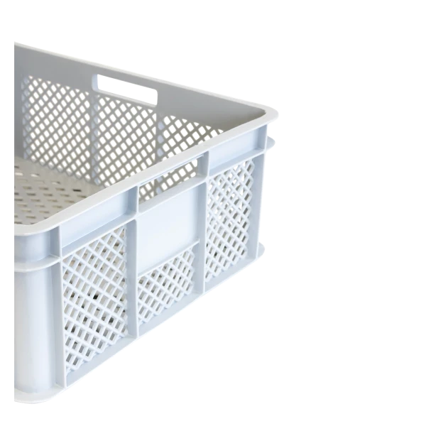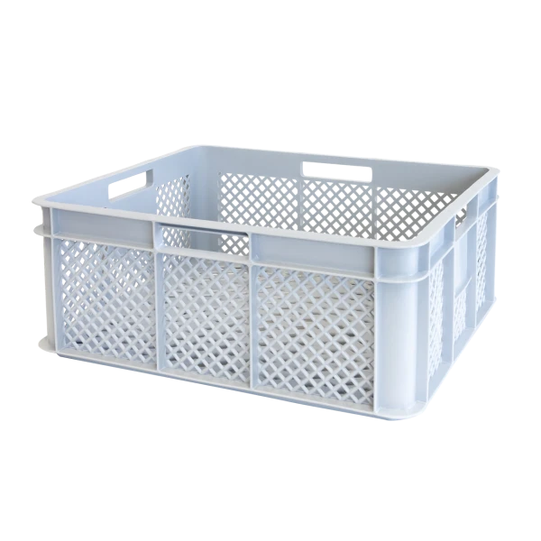 Caisse de stockage en plastique alimentaire (PEHD). Le format compact 400 x 350 mm, ses parois et son fond ajourés et ses poignées pour assurer une bonne prise en main font de cette caisse, une alliée indispensable au quotidien. Caisse empilable de qualité professionnelle.