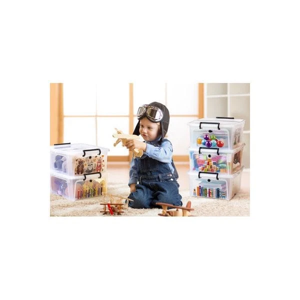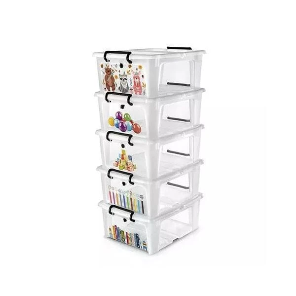 Lot de 5 boîtes multi-rangements à ouverture frontale (facilite la prise des affaires lorsque les boîtes sont empilées), avec décoration spéciale enfants.