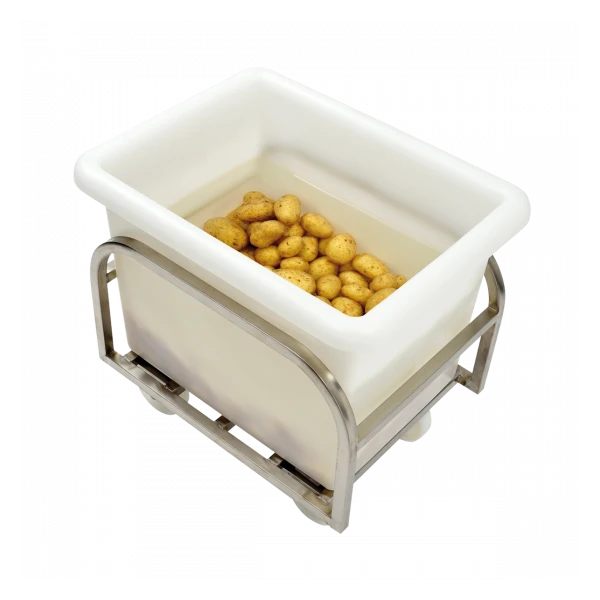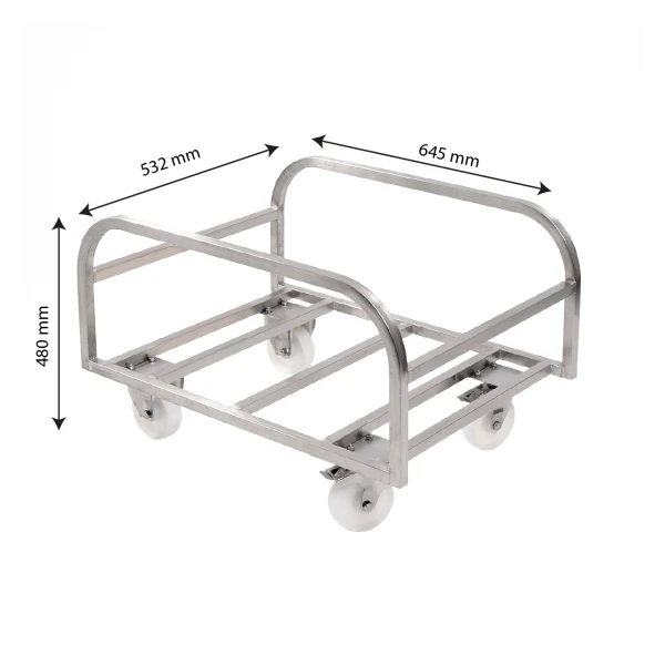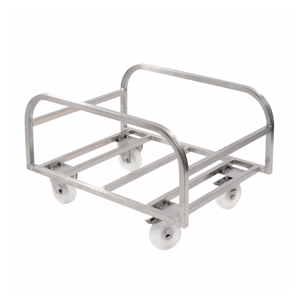 Chariot Inox pour bac grand volume 100 L. Chariot équipé de 2 roues fixes et 2 pivotantes avec freins (roues PA blanc, diamètre 125 mm). Acier Inoxydable recommandé en environnements humides (aucune altération des roulements même en présence d?eau). Hauteur totale Chariot + Bac : 665 mm
