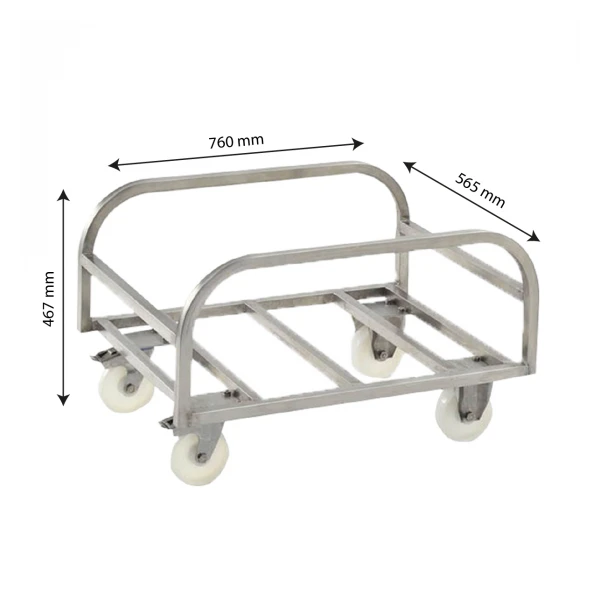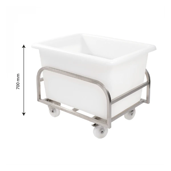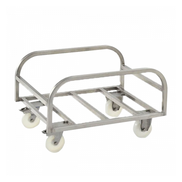 Chariot Inox pour bac grand volume 170 L. Chariot équipé de 2 roues fixes et 2 pivotantes avec freins (roues PA blanc, diamètre 125 mm). Acier Inoxydable recommandé en environnements humides (aucune altération des roulements même en présence d?eau). Hauteur totale Chariot + Bac : 700 mm