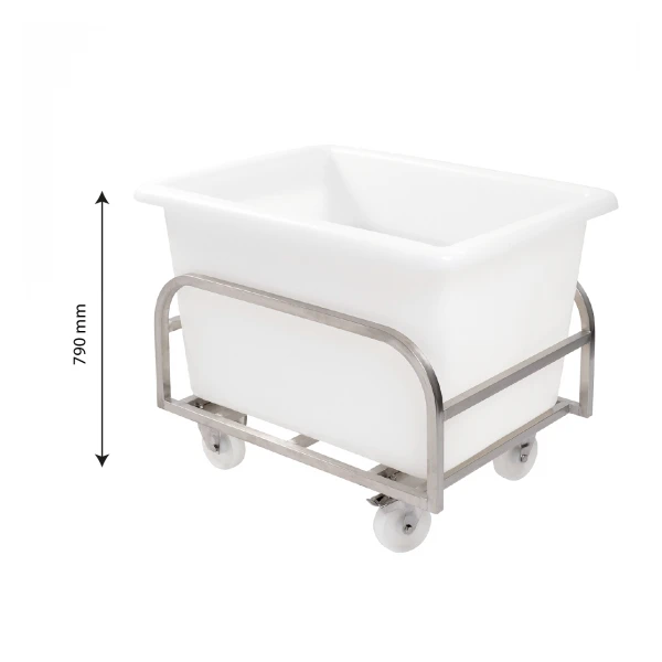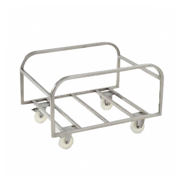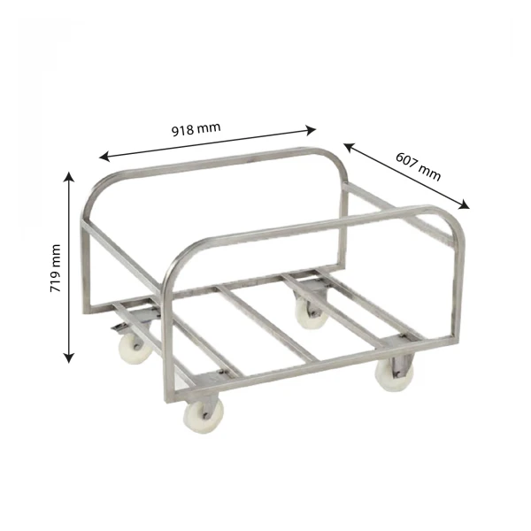 Chariot Inox pour bac grand volume 310 L. Chariot équipé de 2 roues fixes et 2 pivotantes avec freins (roues PA blanc, diamètre 125 mm). Acier Inoxydable recommandé en environnements humides (aucune altération des roulements même en présence d?eau). Hauteur totale chariot + bac : 790 mm