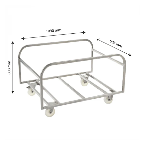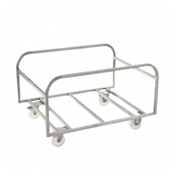 Chariot Inox pour bac grand volume 500 L. Chariot équipé de 2 roues fixes et 2 pivotantes avec freins (roues PA blanc, diamètre 125 mm). Acier Inoxydable recommandé en environnements humides (aucune altération des roulements même en présence d?eau). Hauteur totale chariot + bac : 1045 mm