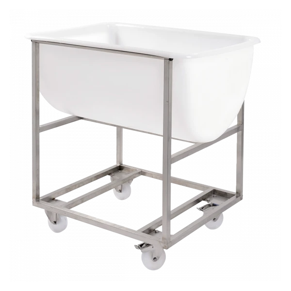 Chariot Inox pour bac grand volume semi-cylindrique « patière » 170 L. Facilite le travail à hauteur d’homme. Idéal pour des utilisations en salaison, saumurage, fromagerie. Chariot équipé de roues en ø125 mm en PA (2 roues fixes et 2 pivotantes freinées). Acier Inoxydable recommandé en environnements humides (aucune altération des roulements même en présence d?eau).