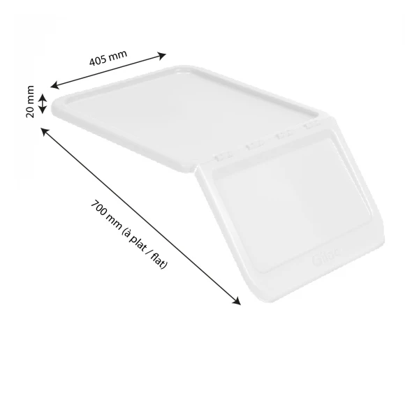 Grande résistance à l’utilisation grâce à des charnières intégrées sans ajout de pièce. Le bac supérieur permet de bloquer le couvercle en position ouverte pour faciliter l’utilisation du bac à ingrédients. Large zone de marquage pour indiquer le contenu du bac. Existe dans une large gamme de coloris ainsi qu’en version transparente. Une seule et même gamme de couvercles pour fermer les bacs à ingrédients 40 L et 80 L. Dimensions du couvercle : – avec le volet rabattu : 450 x 408 x 42 mm. – couvercle à plat : 700 x 405 x 20 mm. – dimensions du colis lors de la livraison : 445 x 410 x 42 mm