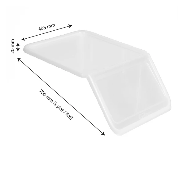 Grande résistance à l’utilisation grâce à des charnières intégrées sans ajout de pièce. Le bac supérieur permet de bloquer le couvercle en position ouverte pour faciliter l’utilisation du bac à ingrédients. Large zone de marquage pour indiquer le contenu du bac. Existe dans une large gamme de coloris ainsi qu’en version transparente. Une seule et même gamme de couvercles pour fermer les bacs à ingrédients 40 L et 80 L. Dimensions du couvercle : – avec le volet rabattu : 450 x 408 x 42 mm. – couvercle à plat : 700 x 405 x 20 mm. – dimensions du colis lors de la livraison : 445 x 410 x 42 mm