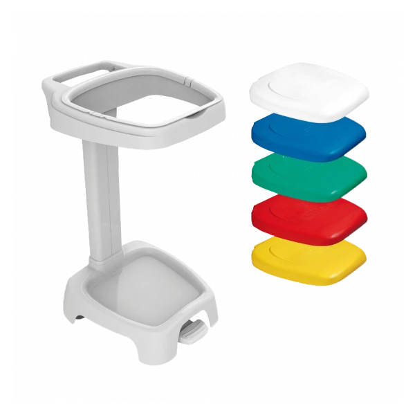Disponible en 5 couleurs pour faciliter le tri sélectif. Le couvercle peut rester ouvert (ouverture manuelle) ou s’ouvrir et se refermer (quand il est actionné avec la pédale).