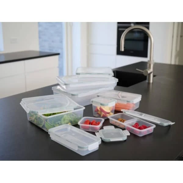 Transparente, avec joint en silicone dans le couvercle et 4 clips de fermeture pour une sécurité supplémentaire.