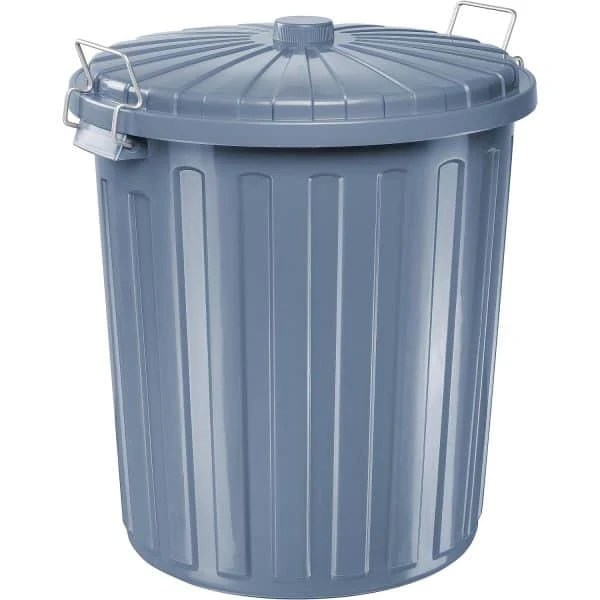 Le matériau de la poubelle est un plastique solide et durable de couleur grise. Le couvercle amovible peut être fermé solidement à l’aide de 2 anses métalliques et les poignées intégrées permettent de la déplacer facilement.