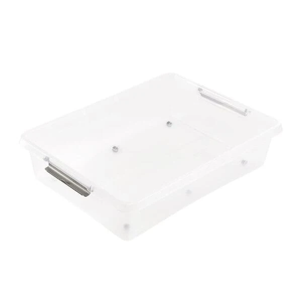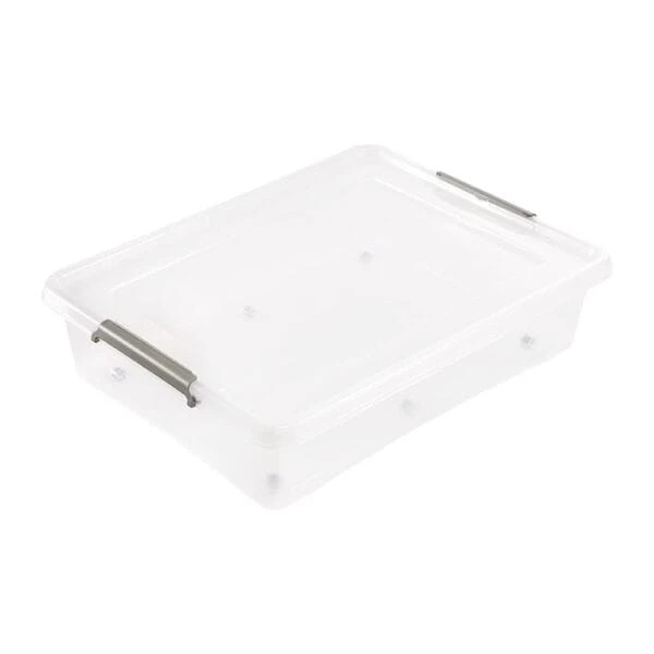 Grande Boîte Plate sous lit à roulettes 61 litres : boîte à roulettes avec couvercle à fermeture fiable à l’aide de clips latéraux, maniement pratique, transparent pour en voir facilement le contenu.