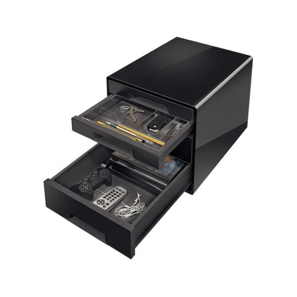 Pour format A4 Maxi, ultra brillant, tiroirs avec butée d’arrêt, fermeture frontale, par simple pression.