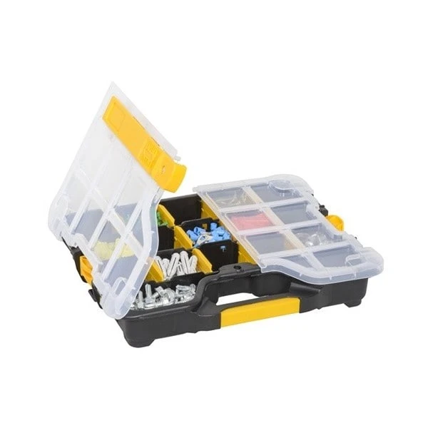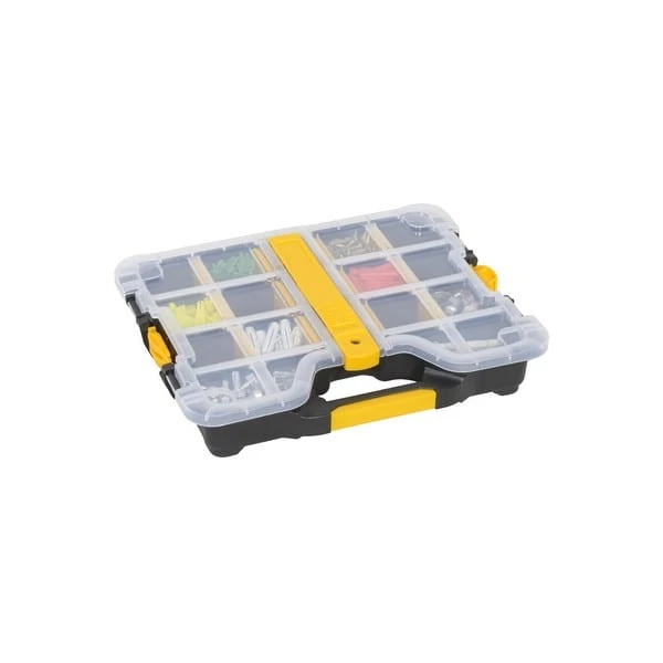 Boîte d’assortiment en polypropylène solide et transparent, compartimentage individuel avec 12 séparateurs.
