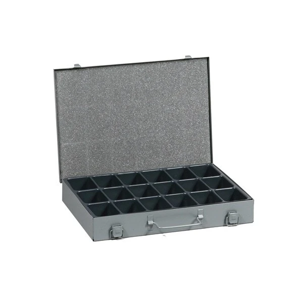 Mallette grise en tôle d’acier thermolaquée, korrex avec 18 casiers fixes.