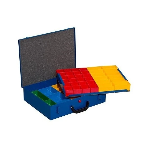 Mallette solide en tôle d’acier revêtue de poudre avec poignée en plastique ergonomique, équipée de 59 casiers amovibles sur 2 niveaux.