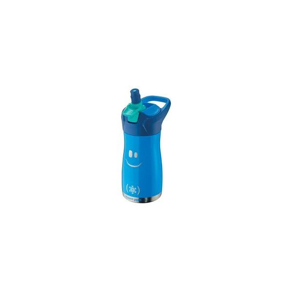 Corps en acier inoxydable et visage souriant, l’embout pour boire sort sur simple presion du bouton.