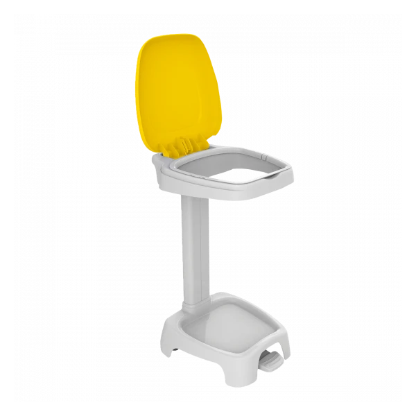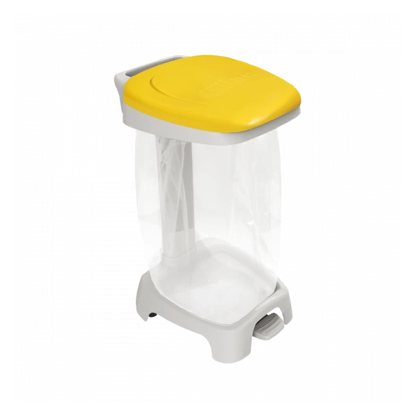 Support sac 120 L avec couvercle jaune. Le couvercle peut rester en position ouverte (ouverture manuelle) ou s’ouvrir et se refermer (quand il est actionné avec la pédale). La pédale permet également d’éviter les contaminations. Support sac équipé de 2 roues pour faciliter le déplacement. 2 roues supplémentaires sont disponibles en option. Mise en place et extraction du sac très facile. La poignée droite, à l’arrière, permet un meilleur positionnement contre les murs. 5 couleurs de couvercle adaptées au tri sélectif sont disponibles. Le support sac couvercle jaune est livré en 2 colis distincts (1 colis pour le support sac, 1 colis pour le couvercle). Support sac livré à assembler.