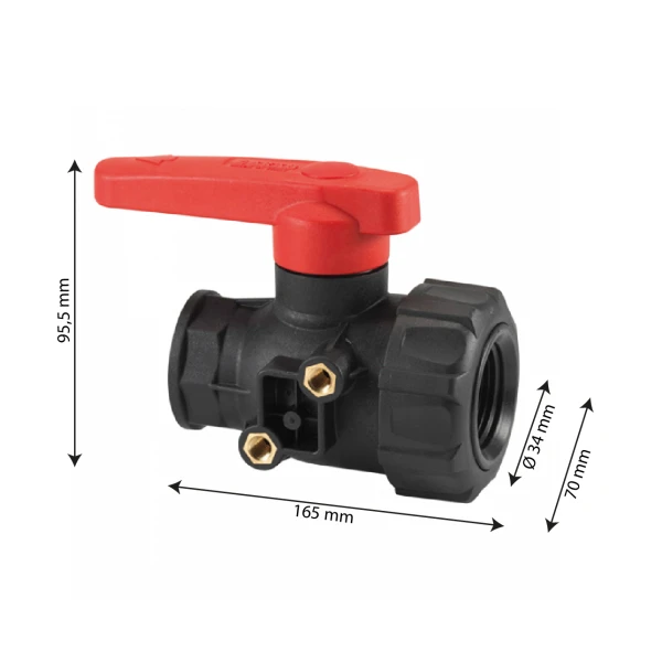 Vanne moyen modèle pour bacs grands volumes de 100 à 220 L. Attention cette vanne n’est pas compatible avec les bacs à double parois. Vanne qui assure un gros débit de vidange – 30 L/minute. Permet d’installer un tuyau de vidange. Passe cloison nécessaire, livré avec la vanne. Filetage femelle de raccordement de 1 pouce pas de gaz. Diamètre de perçage : 33 mm NB : vérifier la possibilité de rotation de la poignée de la vanne sans butter contre la cuve (sécurité = perçage suffisamment bas pour que cette poignée puisse passer sous la cuve).